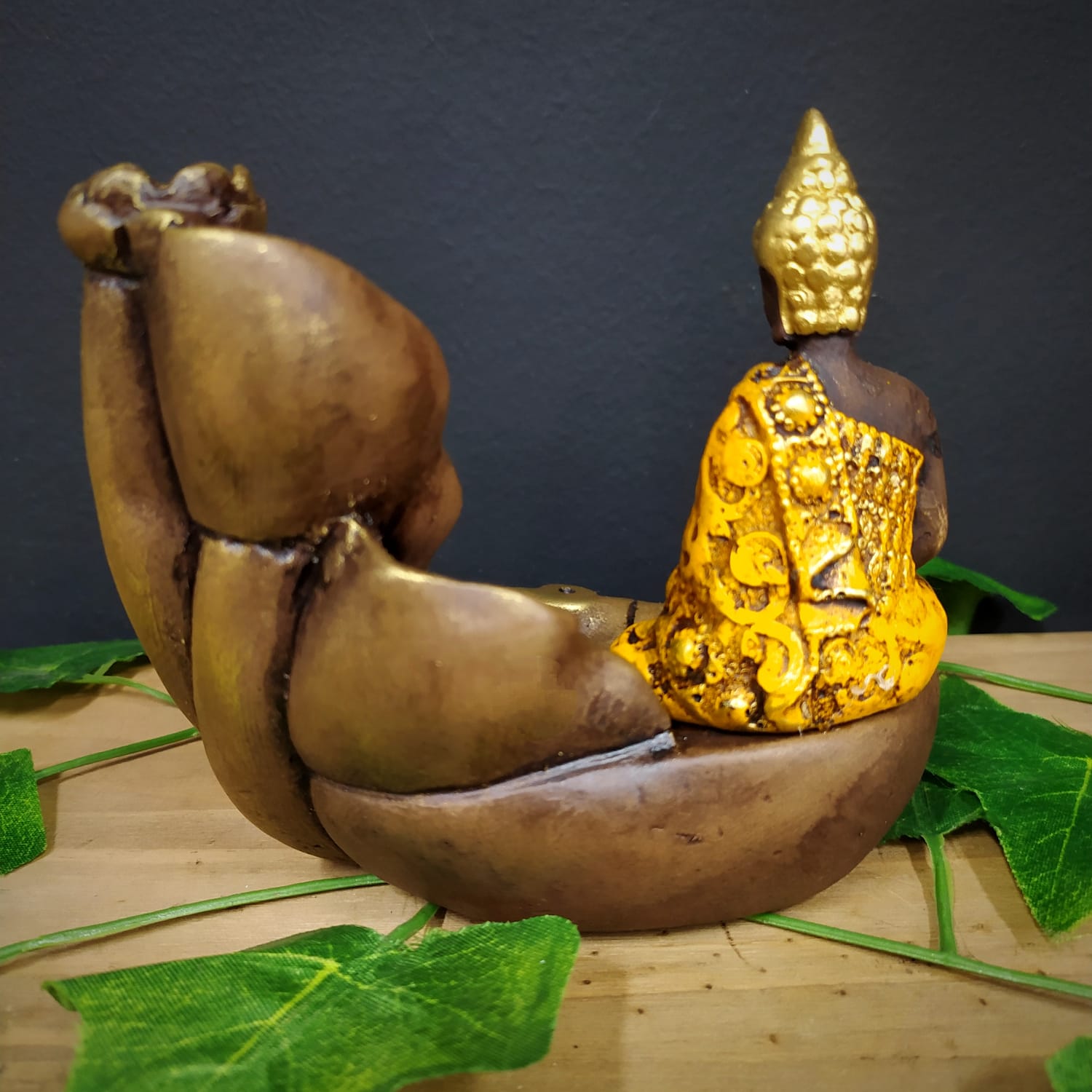 PORTA INCENSO CASCATA FOLHAS COM BUDA MAGRO AMARELO 12CM