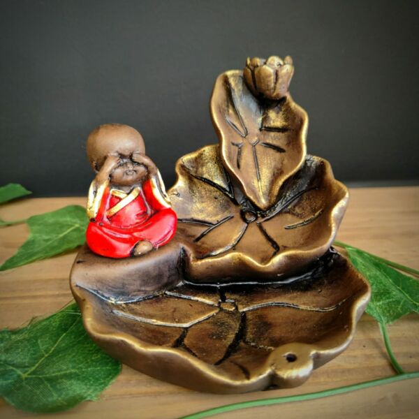 PORTA INCENSO CASCATA FOLHAS COM BUDA VERMELHO 12CM